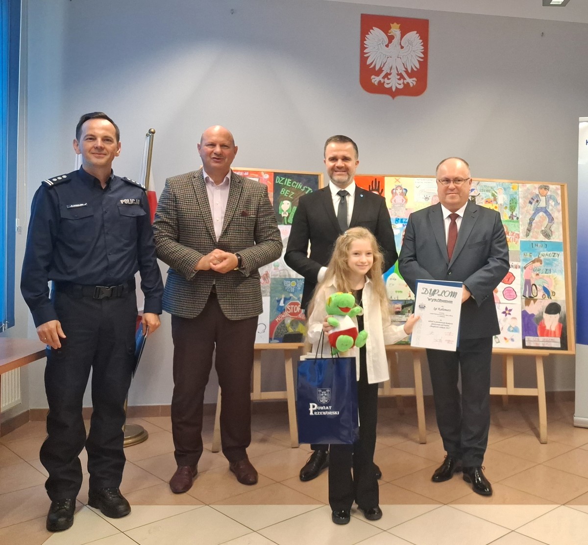 Nagrody zwycięzcom wręczyli Komendant Powiatowy Policji w Przeworsku insp. dr Bartłomiej Kowalski, starosta przeworski Dariusz Łapa, Wójt Gminy Przeworsk Daniel Krawiec oraz Burmistrz Miasta Przeworska dr Leszek Kiesiel. Gratulując sukcesu, wręczający wyrażali swoje uznanie za pomysłowość dotyczącą wyboru tematów oraz wielki wkład pracy i czasu, jaki dzieci włożyły w przygotowanie swoich dzieł. Podziękowania usłyszeli nauczyciele i pedagodzy przygotowujący dzieci do tego konkursu oraz będący na uroczystości przedstawiciele władz samorządowych, którzy wsparli finansowo powiatowy etap konkursu, dzięki czemu zakupiono nagrody dla laureatów.
